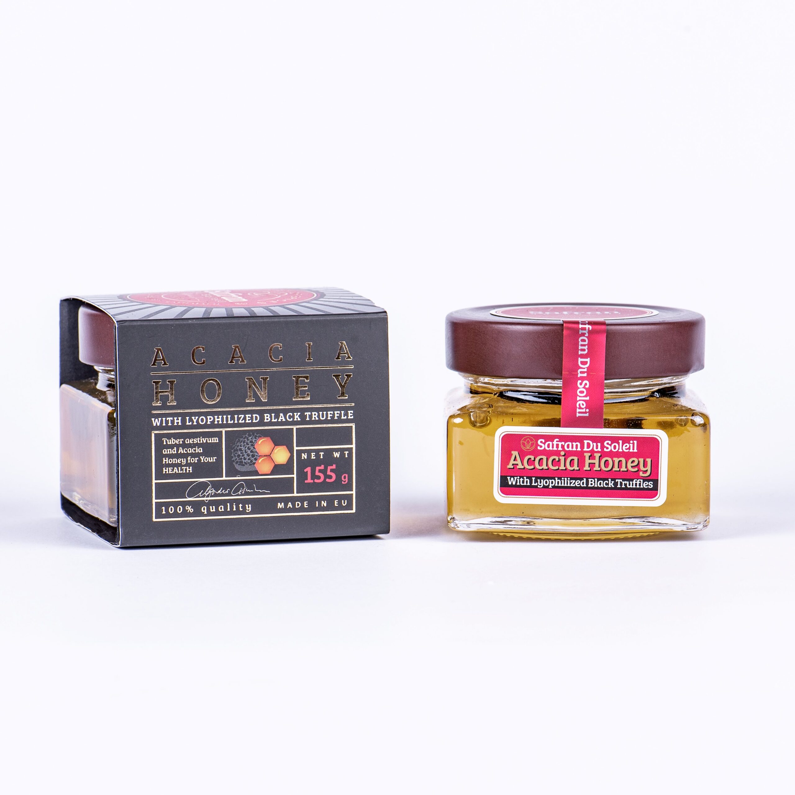Tyras ir termiškai neapdorotas akacijų medus su trumais. Subtilus gėlių aromatas puikiai dera su sodriu, aromatingu trumų skoniu.